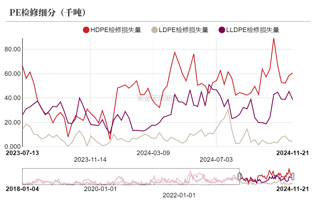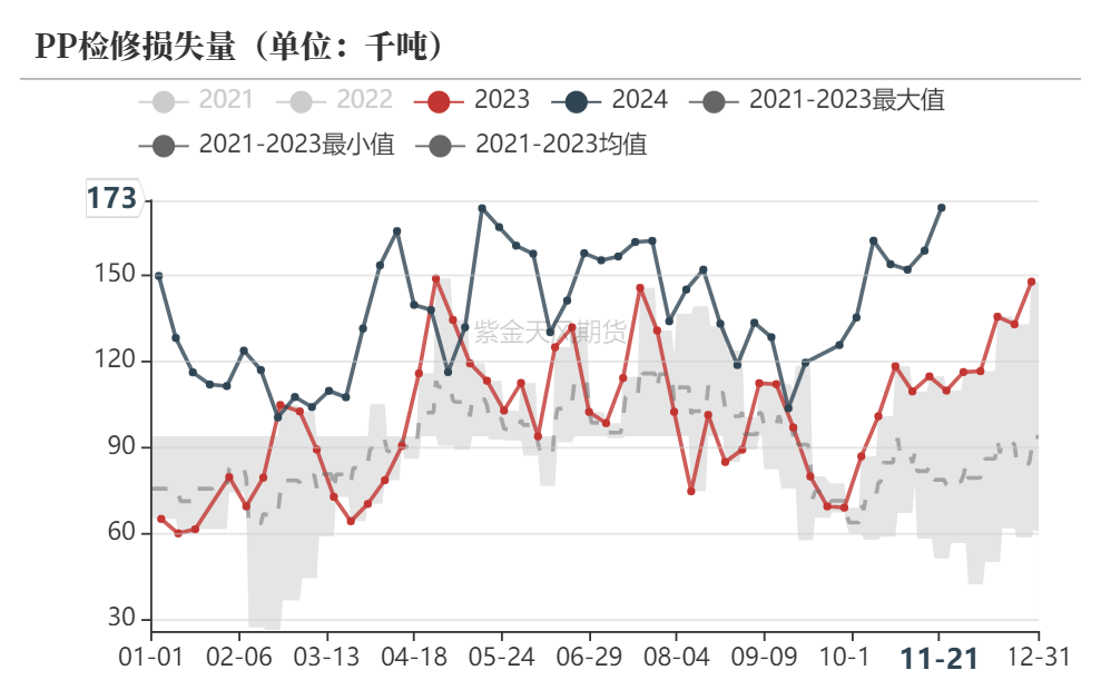 PE测验损失量仍偏高现时仍处于偏高水平,线性供应部分回来,高压测验增多。PP测验损失量再度增多,防守同时偏高水平。11月21日当周PE测验损失量10.3万吨,PP测验损失量17.3万吨。