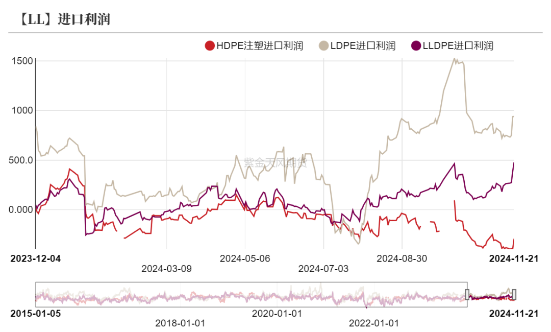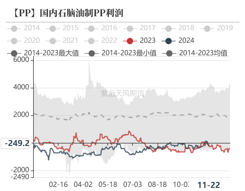 PE入口利润近期均回升,LL入口利润回升显着,HD利润施展偏弱,国内测验偏多导致标品偏紧,内地价钱施展稍强。PP入口利润周内回升,但仍处于盈亏线以下,出口利润防守负值。