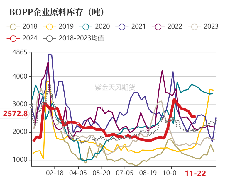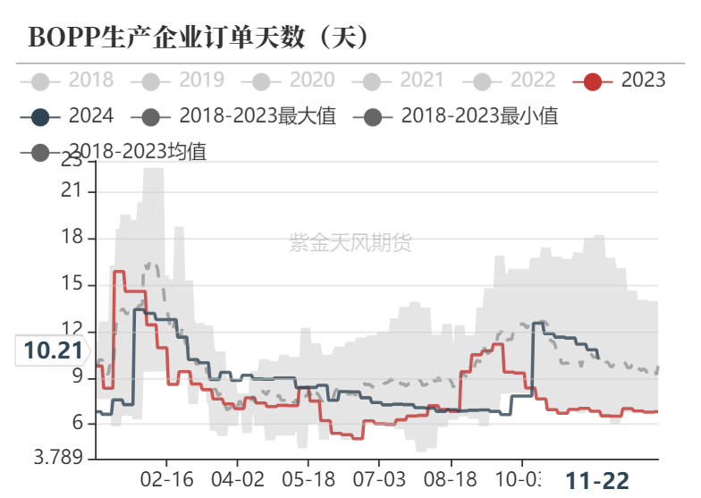 BOPP订单不绝回落,11月22日当周BOPP企业订单天数10.21天。