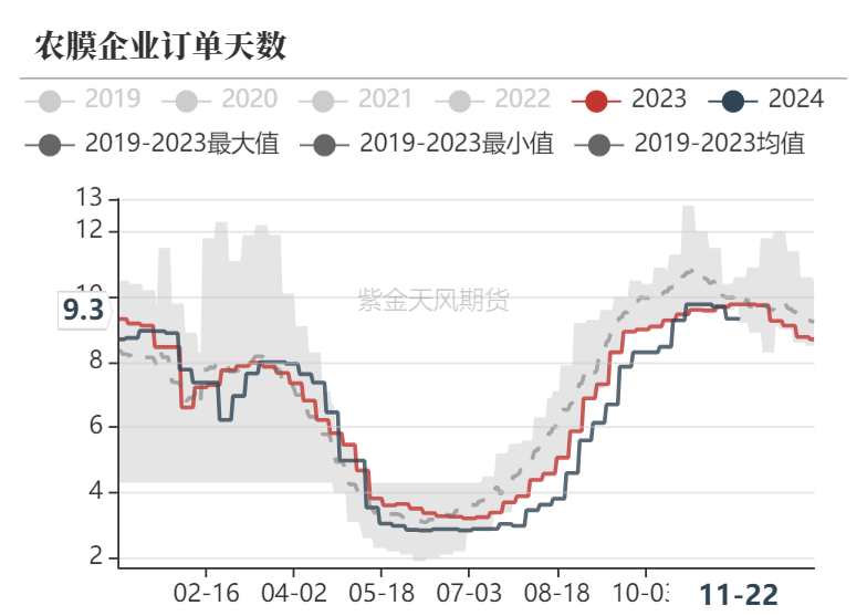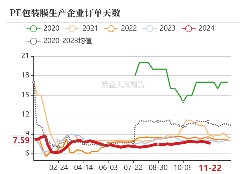包装膜订单小幅回落,死心11月22日当周7.59天;农膜企业订单天数不绝小幅回落,死心11月22日9.3天。