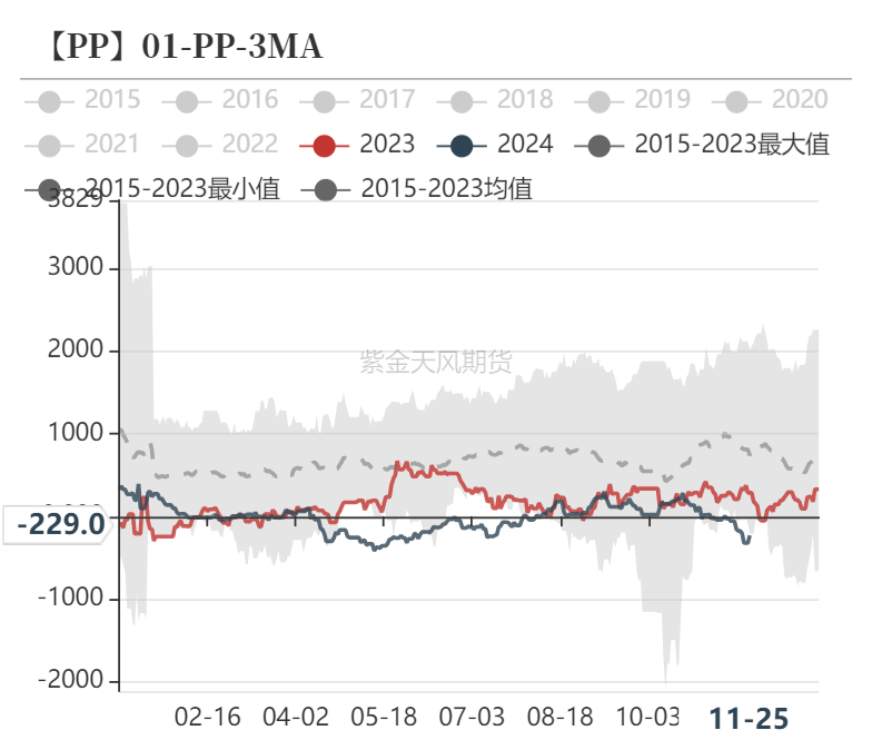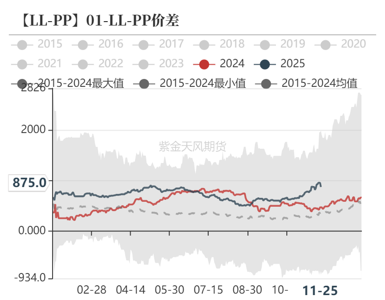 L-PP价差高位回落当仍处于偏高水平,01-L-PP和05-L-PP强弱存在互异,01合约施展更强,其中现货价差更大,互异性的施展主要受本质端互异影响。近期价差的回落也主要由于L近端价钱的冲高回落,探讨PE供应增量逐渐完了,温顺L-PP价差的高位作念缩。