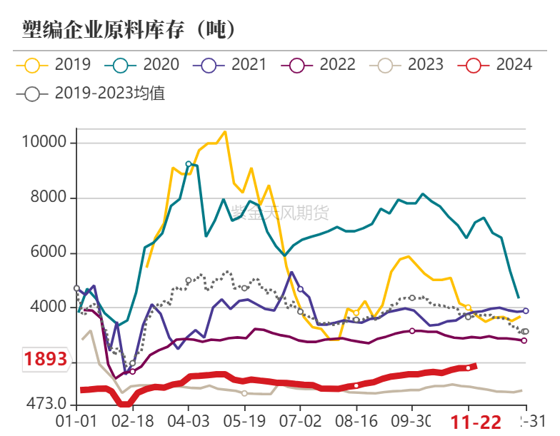 死心11月22日当周,塑编企业原料库存1893吨,制品库存11171.68吨,原料库存加多但卑鄙制品去库。