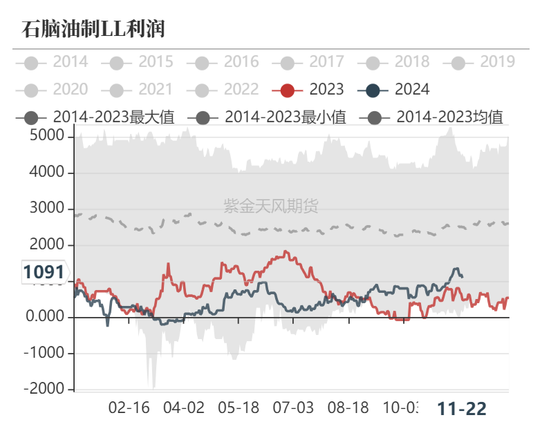 原油价钱偏弱,PP/PE价钱施展相对偏强,导致上游利润近期施展较好,PE利润仍处于年内高位。煤制利润防守较好施展。