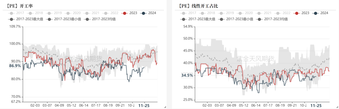 PE安装开工率小幅回升,死心11月25日,国内开工率86.9%,其中线性开工占比34.5%。