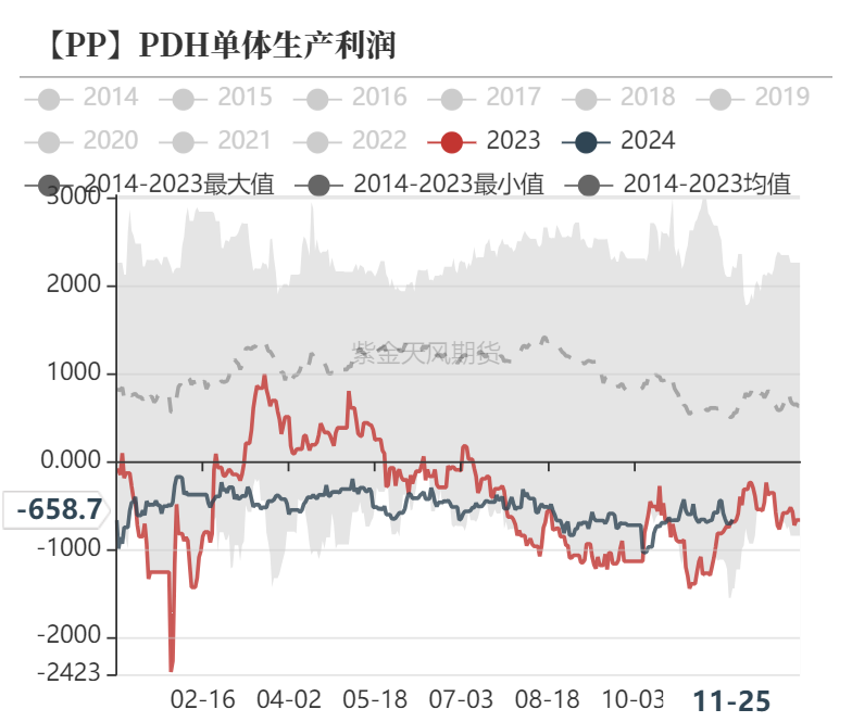 PDH利润:偏多 PDH利润变化不大,丙烷价钱施展偏稳,现时当处于赔本
